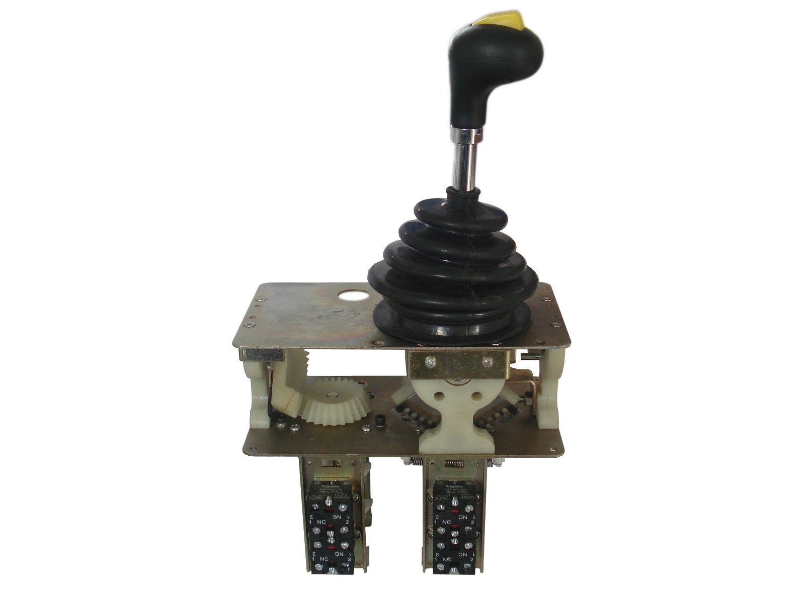 機(jī)械傳動部份裝在箱體上部的罩內(nèi),該傳動機(jī)構(gòu)分為單手柄聯(lián)動操縱機(jī)構(gòu)、抓斗雙手柄操縱機(jī)構(gòu)、主付鉤雙手柄操縱機(jī)構(gòu)、單手柄操縱機(jī)構(gòu)以及單手柄水平操縱機(jī)構(gòu)。手柄運(yùn)動都是用直齒齒輪傳動凸輪軸的??刂破鞯耐馆嗇S均為立式布置,傳動部份各支點(diǎn)全部用滾動軸承,以降低功率損耗。